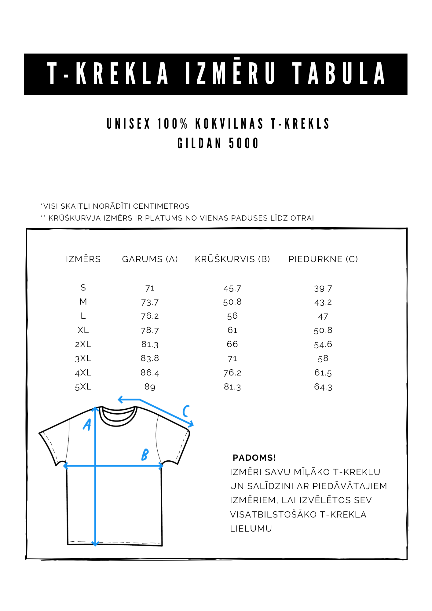 T-kreklu izmēru tabula atrodama attēlu sadaļā.